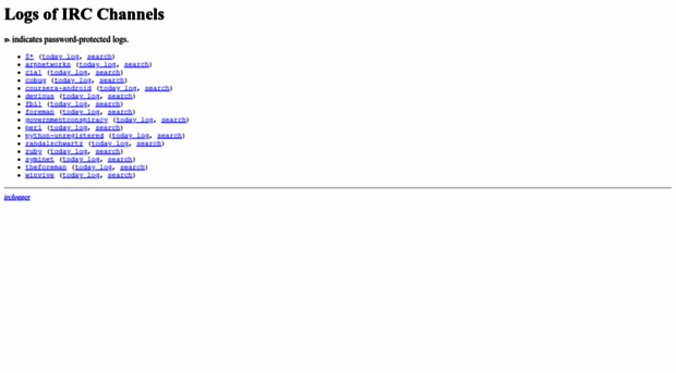 Logs of IRC channels indicates password-protected logs. $*[1] (today log[2], search[3]) arpnetworks[4] (today log[5], search[6]) cia][7] (today log[8], search[9]) cobug[10] (today l...