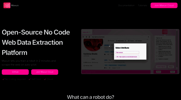 Maxun is the easiest way to build no-code web scraping robots. Open-source, self-hostable, and cloud-ready — an alternative to Browse AI, Octoparse, Apify, and more.
