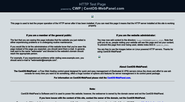 HTTP Test Page CWP | CentOS-WebPanel.com This page is used to test the proper operation of the HTTP server after it has been installed. If you can read this page it means that the HTTP server ins...